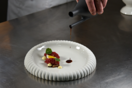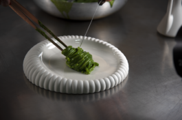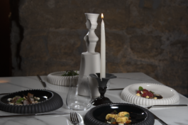 Il piatto Scyphi fa riferimento alla tradizione dell’antico vasellame per la tavola e alle arti applicate delle fornaci di Poseidonia. L’unicità di queste piccole tazze consiste nel decoro o marchio personalizzato per ogni famiglia. In questo caso il reperto archeologico è connotato dal decoro ripetitivo del bordo. Da qui nasce l’ispirazione per il piatto Scyphi che è stato adattato nella forma e nelle dimensioni alle esigenze contemporanee del cibo.
